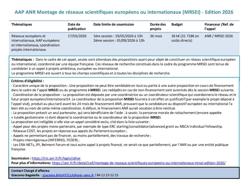 Pour plus d’informations : https://anr.fr/fr/detail/call/montage-de-reseaux-scientifiques-europeens-ou-internationaux-mrsei-edition-2026/