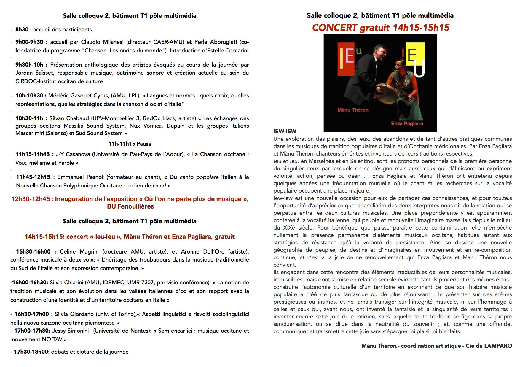 A 14h15 : concert de la chanteuse du Salento Enza Pagliara et du chanteur marseillais Manu Théron