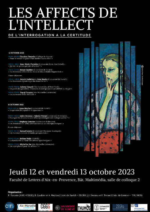 Est-ce à dire alors que seul le jugement serait une attitude purement cognitive ou intellectuelle ? Serait-ce en partie lié au fait qu’ontologiquement il est un pur acte ou un événement, contrairement aux autres attitudes intellectuelles qui viennent d’être mentionnées, qui sont au moins en partie des états ? Qu’en conclure quant au contrôle et à la responsabilité que nous avons à l’égard de ces dernières, à leur rationalité, à leurs conditions de correction, à leur direction d’ajustement, ou à ce qui les distingue ou non d’autres attitudes classiquement tenues pour des émotions pleines et entières, comme la peur, le dégoût ou la colère ? C’est à ces questions que sera consacré le colloque « Les affects de l’intellect : de l’interrogation à la certitude », qu’il abordera aussi bien sous l’angle de la philosophie de l’esprit que de l’épistémologie.