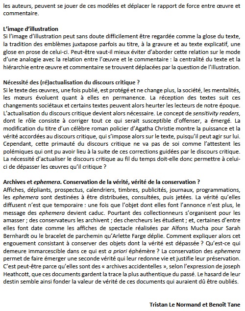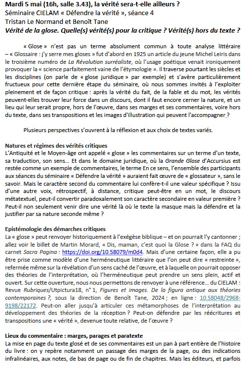 « Glose » n’est pas un terme absolument commun à toute analyse littéraire – « Glossaire : j’y serre mes gloses » fut d’abord en 1925 un article du jeune Michel Leiris dans le troisième numéro de La Révolution surréaliste, où l’usage poétique venait ironiquement provoquer la « science parfaitement vaine de l’étymologie ». Il traverse pourtant les siècles et les disciplines (on parle de « glose juridique » par exemple) et s’avère particulièrement fructueux pour cette dernière étape du séminaire, où nous sommes invités à l’exploiter pleinement et de façon critique : après la vérité du fait, de la fable et du mot, les vérités peuvent-elles trouver leur force dans un discours, dont il faut encore cerner la nature, et un lieu qui leur serait propre, hors de l’œuvre, dans ses marges et ses commentaires, voire hors du texte, dans ses transpositions et les images d’illustration qui peuvent l’accompagner?