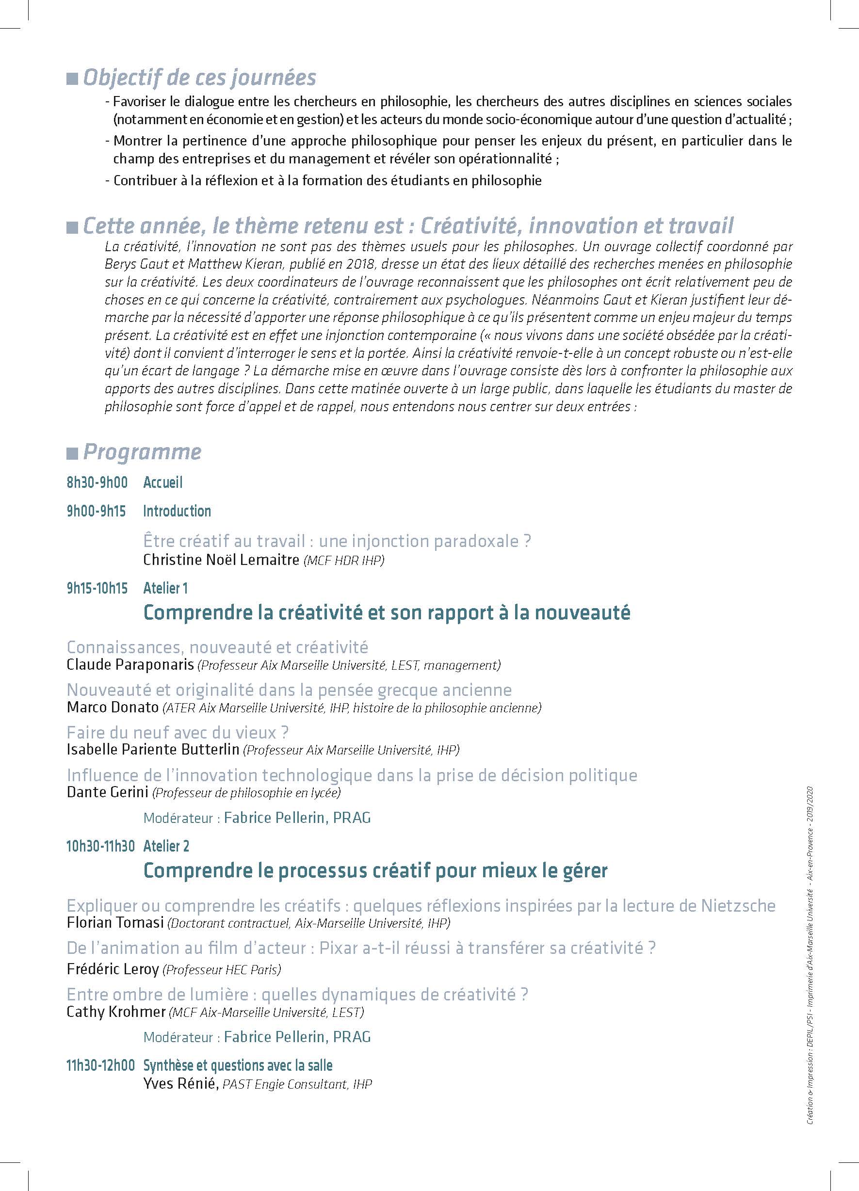 Cette matinée réunira des enseignants chercheurs en philosophie et en management et des professionnels autour deux ateliers : le premier permettra de clarifier les rapports entre nouveauté et innovation, le second questionnera les ressorts de la créativité et de sa gestion. Le format de la matinée permet l’articulation d’une introduction générale au problème, de courtes présentations théoriques restituant des recherches récentes menées sur ces questions et un temps d’échange entre le public et les intervenants. La matinée Philosophie et entreprise est gratuite, accessible à un large public d’étudiants en philosophie ou d’autres disciplines, de professionnels curieux de l’apport potentiel de la philosophie à leurs pratiques et de chercheurs désireux de se confronter aux besoins et aux questionnements actuels du monde socio-économique.