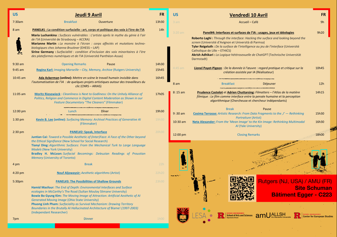 Nous vous invitons à nous rejoindre les 9 et 10 avril, à « Artificiality | Surfaciality », une conférence internationale organisée conjointement par le Département de Français de l’Université Rutgers (New Brunswick, USA) et le laboratoire du LESA d’Aix-Marseille Université (France), consacrée aux enjeux de l’intelligence artificielle, de l’esthétique et des humanités.
