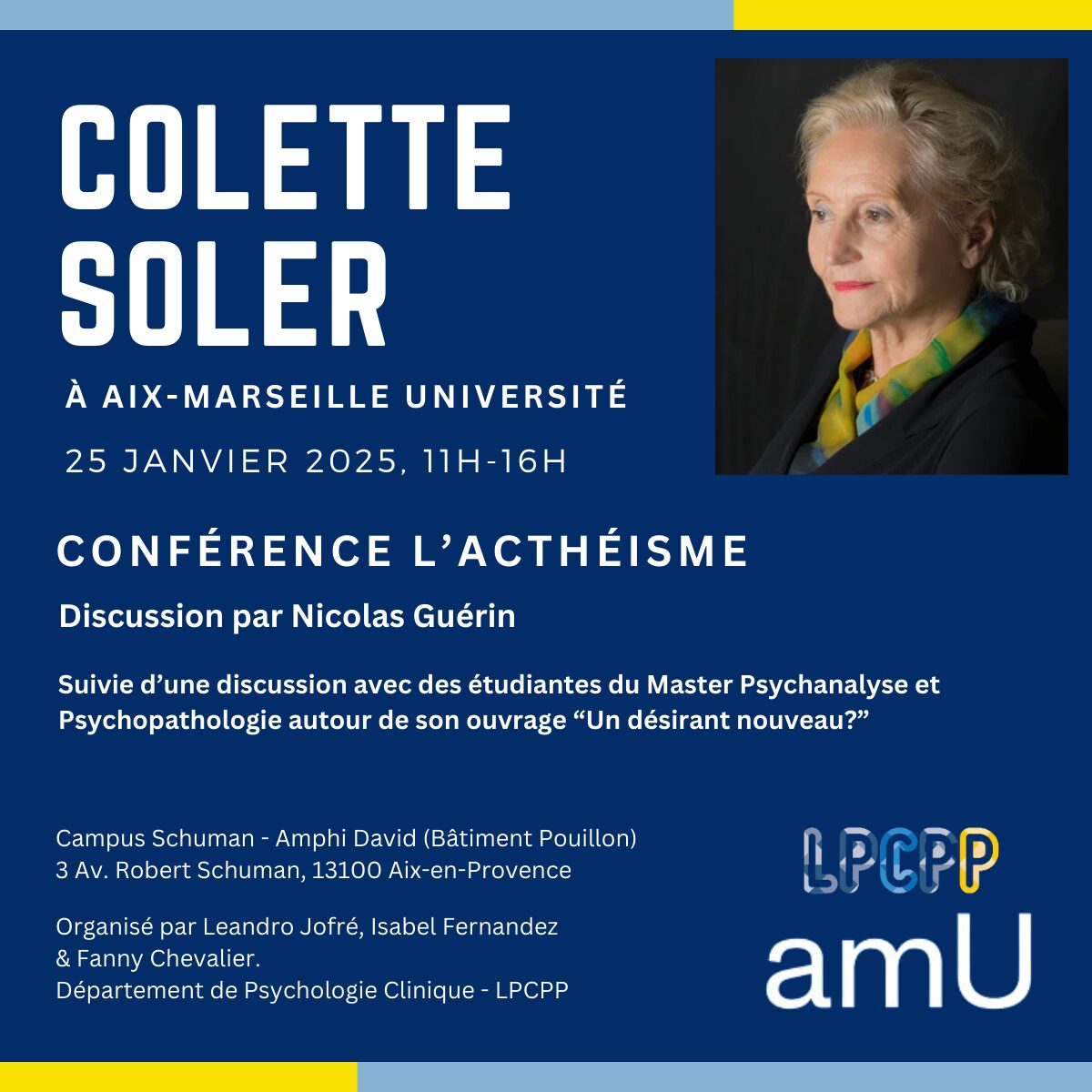14h30-15h30 : Discussion de Colette Soler avec les étudiants du Master Psychanalyse et Psychopathologie (PP) autour de son ouvrage « Un désirant nouveau ? »