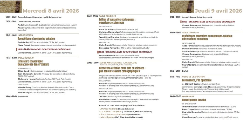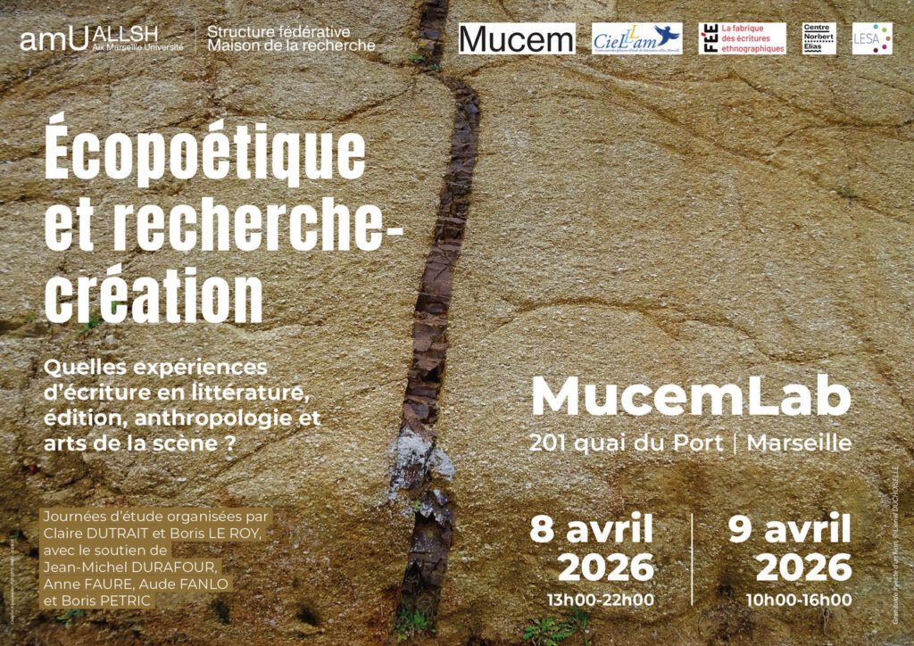 Comment la recherche-création peut-elle constituer une réponse à la crise écologique ? Telle est la question centrale de ces journées d’études organisées grâce à un partenariat entre Aix-Marseille Université, le MucemLab, le Centre Norbert Elias et la Fabrique des écritures ethnographiques. En rassemblant des actrices et des acteurs de la recherche et de la création, en écriture littéraire, anthropologie visuelle et arts de la scène autour de tables rondes, de projections-discussions et de conférences-performances, elles seront l’occasion d’explorer les expériences d’écriture par lesquelles transformer nos modes de connaissance, nos manières d’habiter le monde, et contribuer à l’émergence de communs.