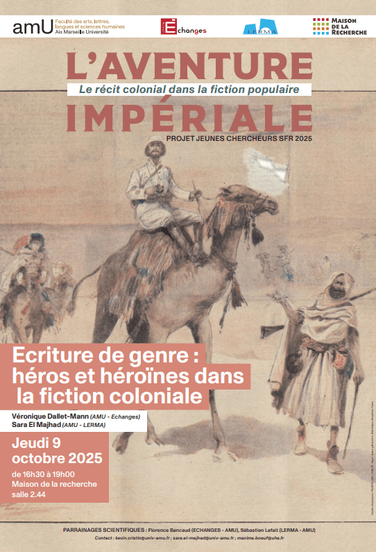 Nous sommes heureux de vous convier Ă la prochaine sĂ©ance du sĂ©minaire « L’aventure impĂ©riale : Le rĂ©cit colonial dans la fiction populaire », prĂ©vue le jeudi 9 octobre 2025 Ă 16h30, Aix-Marseille UniversitĂ©, Salle 2.44 – Maison de la recherche. Cette nouvelle sĂ©ance s’intitulera « Ecriture de genre : hĂ©ros et hĂ©roĂŻnes dans la fiction coloniale ».Â