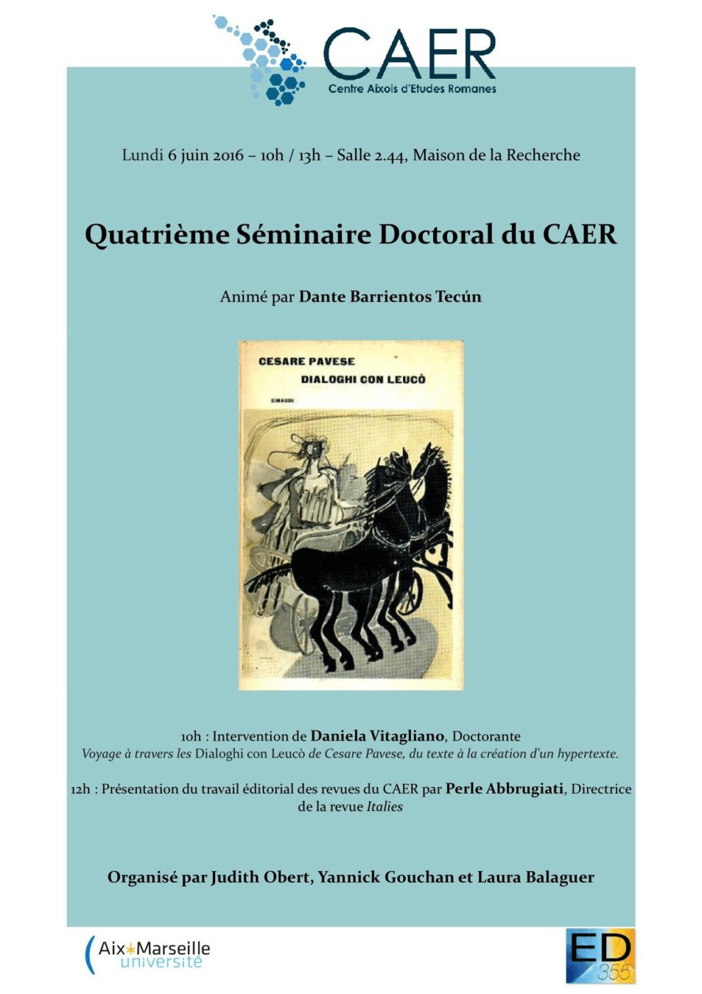 Lundi 6 juin 2016, 10h00-13h00. Séminaire doctoral du CAER animé par Dante Barrientos Tecún. CAER Centre Aixois d'Études Romanes. Lieu : Faculté ALLSH, 29 av. R. Schuman, Aix-en-Provence. Maison de la Recherche, salle 2.44. |