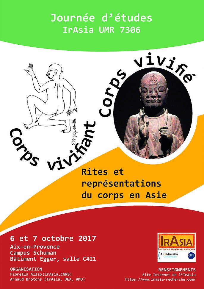 Vendredi 6 et samedi 7 octobre 2017, 14h00-17h00. Journées d'étude "Corps vivifiant corps vivifié : les logiques du corps en Asie" Planning Résumés Porteurs de projet : Fiorella Allio (allio@gate.sinica.edu.tw) et Arnaud Brotons (arnaud.brotons@univ-amu.fr) IRASIA Institut de Recherches Asiatiques Lieu : Faculté ALLSH, 29 avenue Robert Schuman, 13100 Aix-en-Provence. Bâtiment Egger, salle C 241.