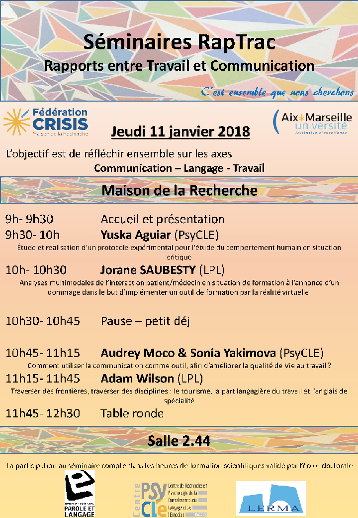 Mercredi 10 janvier 2017, 9h00-17h30. Faculté ALLSH, 29 avenue Robert Schuman, 13100 Aix-en-Provence. Bâtiment Egger, salle C 423. |