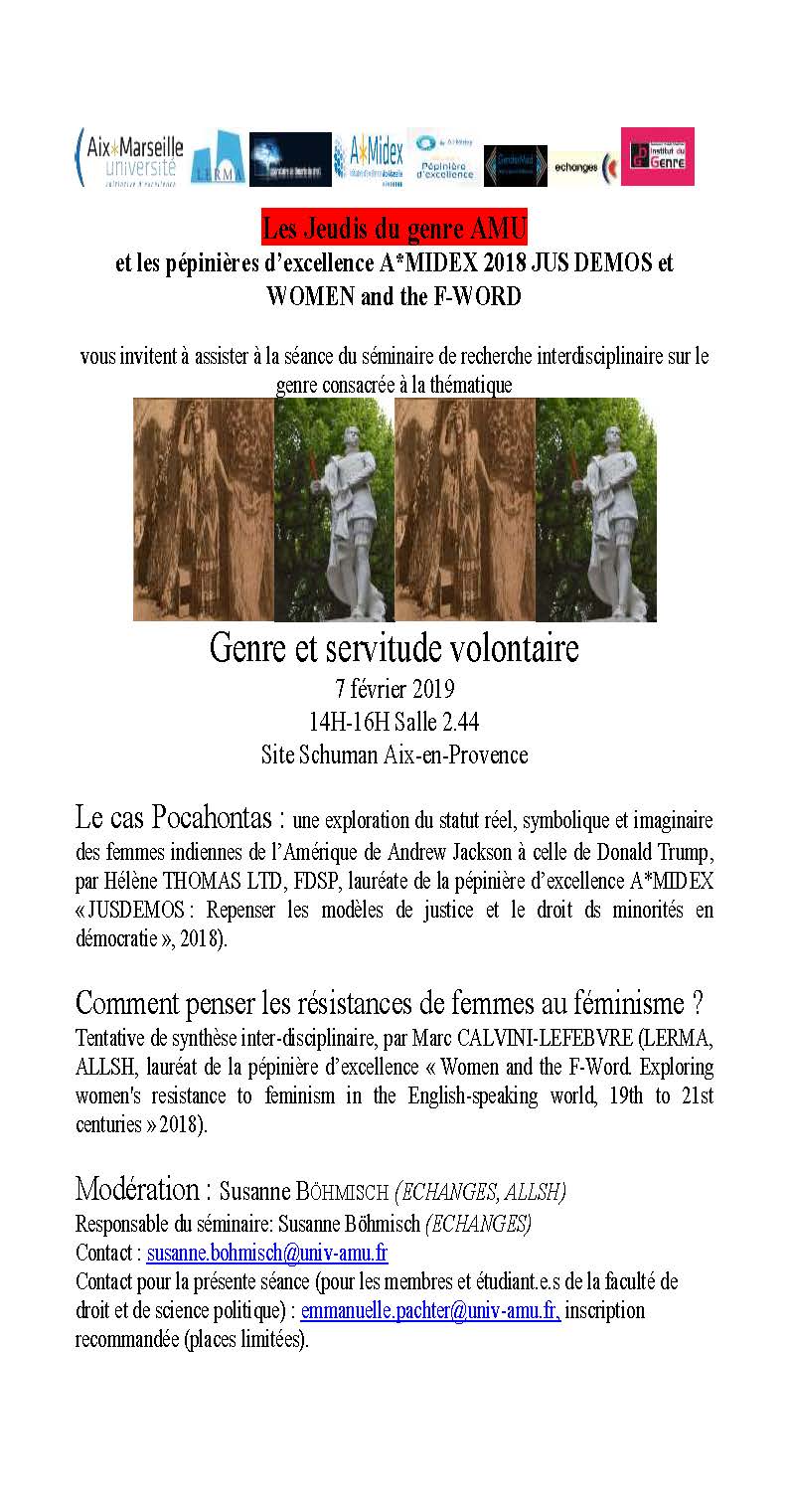 Titre de la séance : Genre et servitude volontaire Hélène THOMAS (LTD Laboratoire de Théorie du Droit) : Le cas Pocahontas Marc CALVINI-LEFÈBVRE (LERMA) : Comment penser les résistances de femmes au féminisme ? Tentative de synthèse inter-disciplinaire. "Les jeudis du genre AMU", une initiative des correspondant.es des 17 laboratoires AMU affilié.es à l'Institut du Genre à Paris […] |